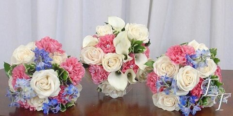 Most bouquets are designed as European hand tied bouquets. Here you want to pick a design that has the same style and feeling as your bridal bouquet. In the wedding below, the bouquet located in the middle is a design that features white Calla Lilies, White Roses, and Pink Carnations (Carnations happened to be our bride’s favorite flower). The attendant bouquets were similar except they did not include the very expensive Calla Lilies and we added a Blue Delphinium which picked up the color of the dresses. All the flowers coordinated, but he bridal bouquet was distinctive.