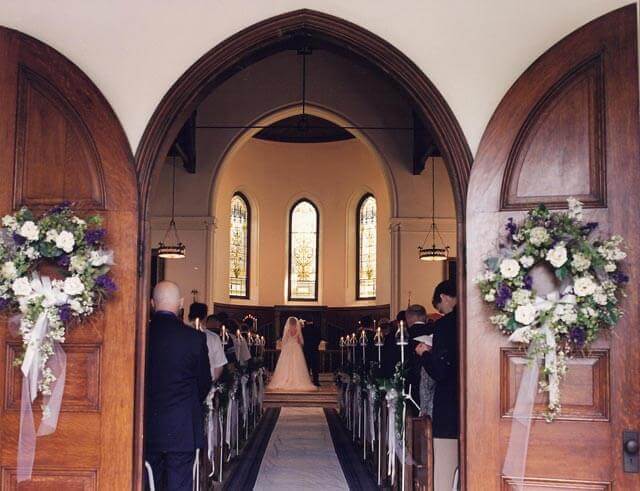 Other items popular with brides are garlands on railings entering into the church, arrangements at the entrance of the church, and cones of rose petals to throw at the happy couple when they exit the church. Some churches let you do whatever you want to decorate, but more often, they have specific rules about what they will and will not allow. So before you order any flowers, make sure you know all the rules.