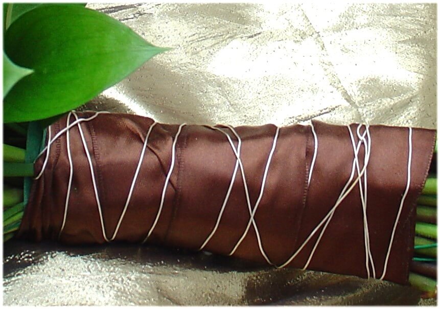 Red, Yellow, and Deep Orange Roses accented with yellow Solidego make this a perfect bouquet for an autumn wedding. We have finished the bouquet with brown satin ribbon and gold wire detail.
