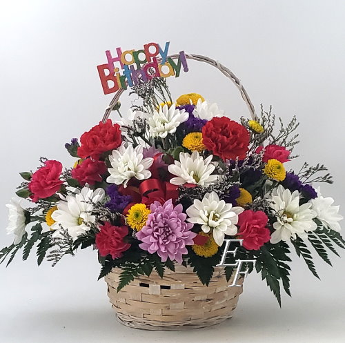 Wish someone Happy Birthday with our colorful Birthday Bouquet made from long last flowers! Carnations, Miniature Carnations, and assorted Chrysanthemums are the flowers we use in this bouquet. We add a Happy Birthday special occasion pick and festive curling ribbon. The finished design is 16″ x 16″.