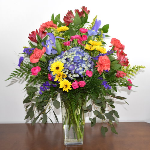 Bursting with color, this arrangement features Hydrangea, Alstroemeria, Iris, long lasting carnations and mums. The arrangement shown is designed to be a one-sided design. When complete the design measures approximately 24″ x 17″. Vase will vary depending upon availability. Upgrades would include additional similar flowers and would change the design from a one-sided arrangement to an all around arrangement.