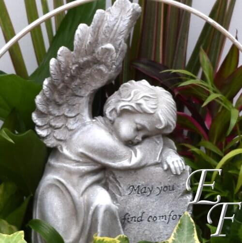 Our Comfort with Angels Planter features our Comfort with Angels Plaque surrounded by an assortment of green plants suitable for indoors. The plaque is 9 1/2″ tall and reads “May you find comfort in the arms of an angel.” As we are a growing operation, we make the gardens ourselves ensuring better quality and value for our customers. Keep in mind, our plant assortments vary depending upon availability. All planters come with a bow, if you require a specific color bow or flower color, please note in the special instructions.
