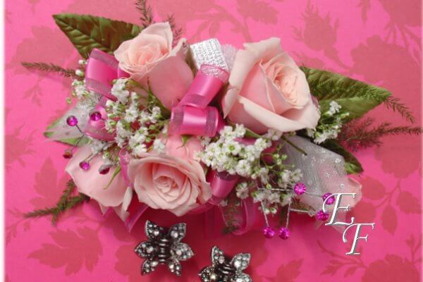Pink sweetheart roses accented with baby’s breath, deep pink ribbon, and pink gemstone sprays. We have all kinds of personalization options which include choosing your ribbon color, the color of your gemstone sprays and pins. We also have a large gallery of corsage bracelets for you to choose from. Bracelets are an upgrade ranging from $5.00 to $8.00 depending on your choice. You can also select to add a coordinating boutonniere for an additional charge.