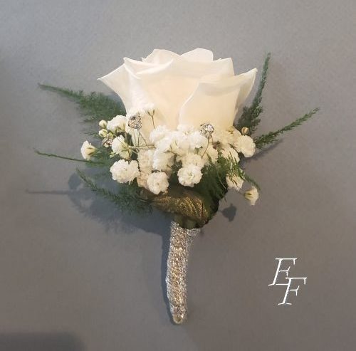 Classic white sweetheart roses with silver accents. We have all kinds of personalization options which include choosing your ribbon color, the color of your gemstone sprays and pins. We also have a large gallery of corsage bracelets for you to choose from. Bracelets are an upgrade ranging from $5.00 to $8.00 depending on your choice. You can also select to add a coordinating boutonniere for an additional charge.