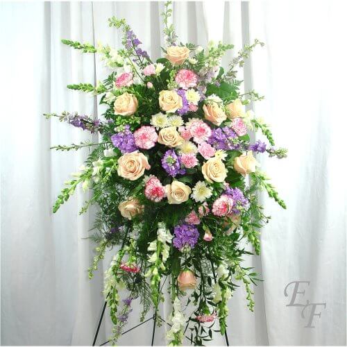 This cascading spray is part of our English Garden Tribute Collection. We use white snapdragons, purple larkspur, and lavender stock to create the cascading look of this design. The open roses are in shades of pink. This is one of our larger standing sprays measuring 46″ in length, and mounted on a 48″ easel. You may add script to this design at no additional charge.