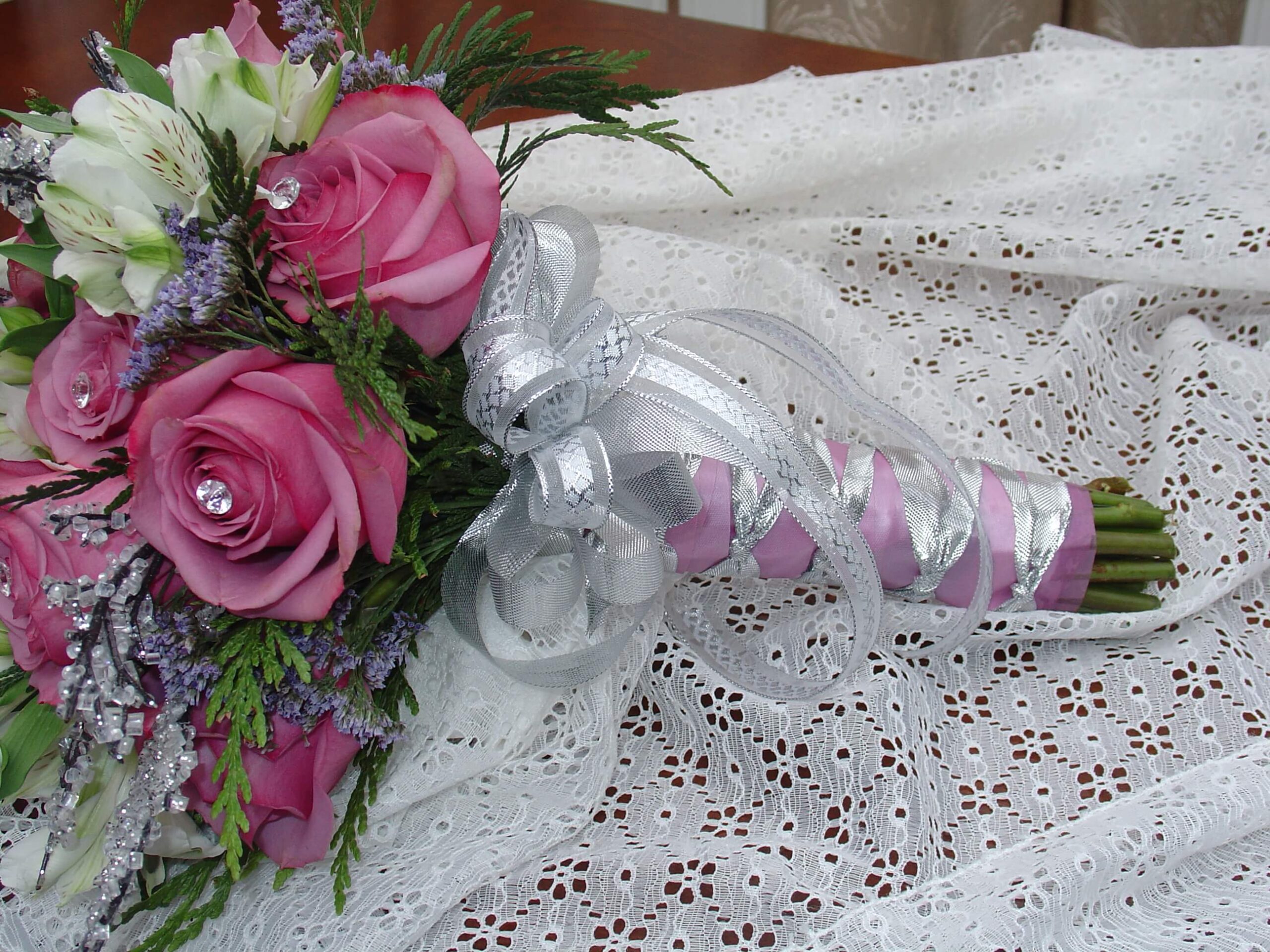 Our Lavender Ice Wedding Bouquet is perfect for a bride or bride’s maid. It features cool water roses accented with crystal gemstone pins. White alstromeria, ice branches, and cedar complete this design perfect for a winter wedding.