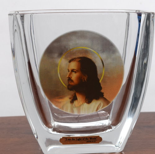 This arrangement features a lead crystal vase with an image of Christ. Lettering under the image reads “Light of the World”. This arrangement measures approximately 13″ x 13″.