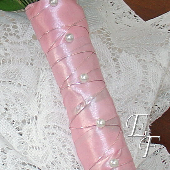 Carnation Bouquets are affordable, but they do not have to be boring. In this Pink Carnation Bouquet we have added white pearl pin accents to our flowers and white Limonium. The bouquet is finished with pink satin ribbon, pearl pins, and pink wire wrap. We have also created options for you to select matching corsages and boutonnieres for this wedding theme. The corsage is made of pink miniature carnations with pearl accents & white limonium. It is designed on a pearl bracelet that can be kept as a keepsake once the flowers are gone. The boutonniere is a pink standard Carnation that is finished in pink ribbon to match the ribbon on the bouquet.