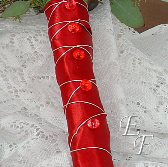 Red Carnations take on a classic look when accented with red Hypericum Berries and red gemstone accents. We also added some seeded Eucalyptus to our bouquet to add some contrast. The gemstone pins are a subtle accent, but add a little sparkle. We have designed a matching boutonniere and corsage for this wedding bouquet option. The corsage is made of red miniature carnations designed on a raspberry bracelet. The bracelet is a keepsake that can be used after the flowers are gone. The boutonniere is a standard red Carnation accented with a red gemstone to coordinate with the bouquet and it is finished with red ribbon and silver wire.