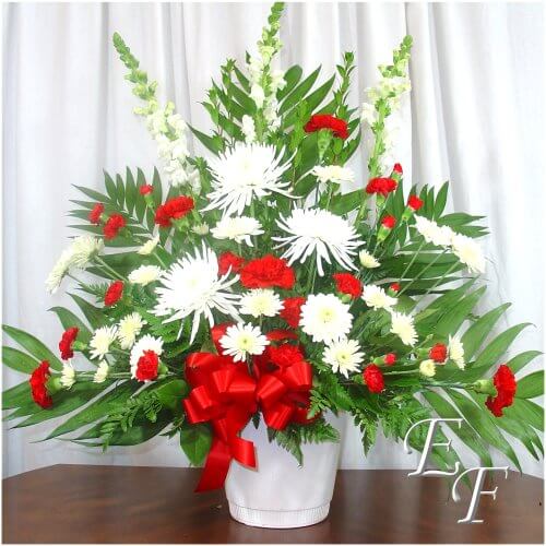 This is a traditional funeral basket made out of snapdragons, carnations, fugi mums, and chrysanthemums. The design is shown in red and white, but you can choose to have it made in all white flowers, or pink and white flowers. You also have the option to upgrade the design to make it fuller and more showy. When finished, the design is approximately 42″ tall.