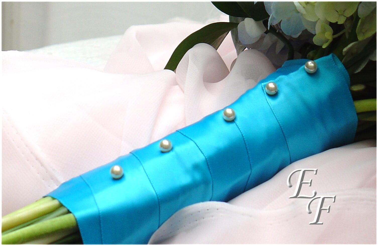 Our Romantic Garden Bridal Bouquet features blue hydrangea, Vendella Roses (white), Ocean Song Roses (lavender), Raspberry Gerbera Daisies, Calla Lilies, and Sweet William. You can finish your bouquet with any color satin you wish. We are showing a Caribbean blue satin to co-ordinate with the hydrangea.
