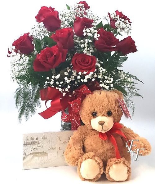 Want to make sure you get her the right gift!! This product has all the traditional Valentine’s Day gifts that she might be expecting. It includes one dozen roses of any color or color mix, a half pound box of handmade chocolates, and our 14″ soft and cuddly Valentine’s Bear. You may also supersize your gift by increasing the box of chocolate to a 12 ounce box. We will have a good inventory of flowers, candy, and bears for the holiday, but you should always order early! We will be making deliveries all day Valentine’s Day.