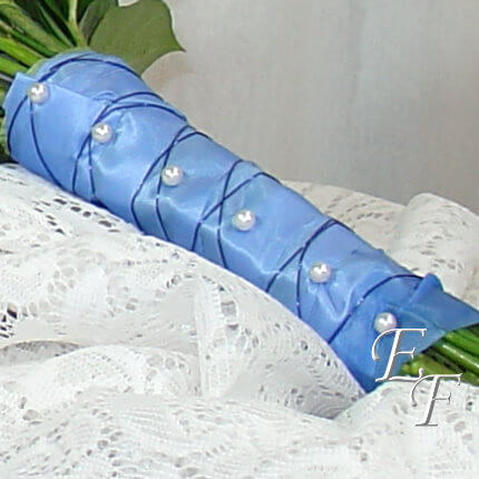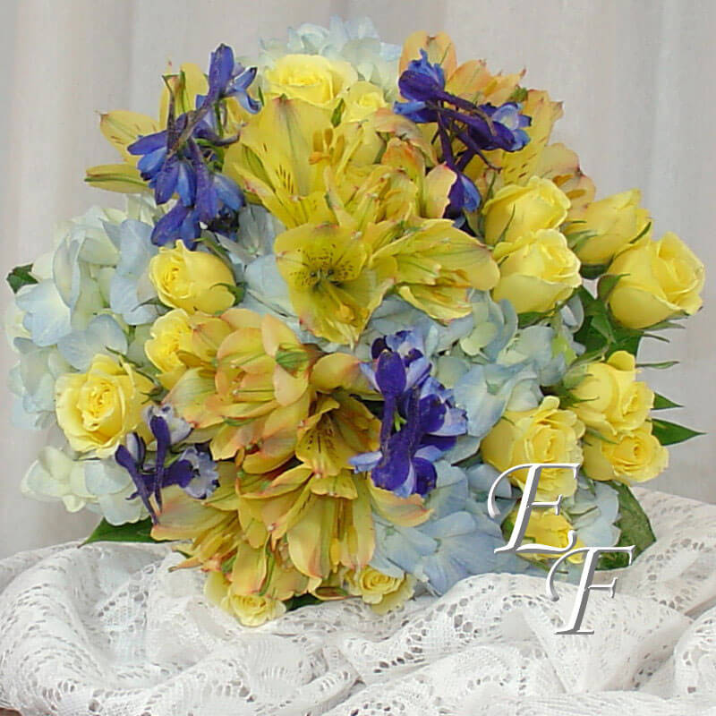 Our Springtime Blue Wedding Bouquet is a European hand tied bouquet that is perfect for a bride or bride’s maid. It features pastel blue hydrangea, lemon yellow alstromeria, pale yellow spray roses, and electric blue delphinium. It is finished with delphinium blue satin ribbon accented with royal blue wire and pearl detail.