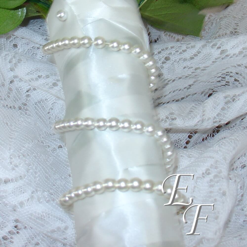 This bouquet bears the name of the rose variety that is featured in the design. White Dove Roses are a variety for those brides who want roses that are white as opposed to creamy or an off white. We have accented the roses with Electric Blue Delphinium and yellow Alstromeria. In addition, we have used white Stock to create the background for our design. White Stock is a true white and is used here to fill in the design. We have finished our bouquet with white satin and pearl roping.