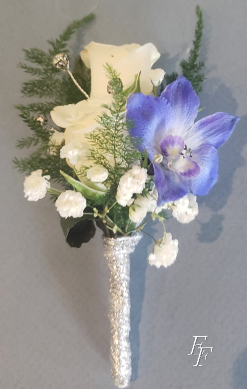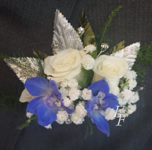 White Sweetheart Roses and Electric Blue Delphinium make a striking combination! We have all kinds of personalization options which include choosing your ribbon color, the color of your gemstone sprays and pins. We also have a large gallery of corsage bracelets for you to choose from. Bracelets are an upgrade ranging from $5.00 to $8.00 depending on your choice. You can also select to add a coordinating boutonniere for an additional charge.